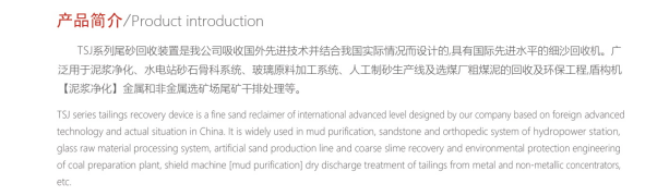 簡(jiǎn)介—— TSJ系列尾砂回收機(jī)是我公司吸收國(guó)外先進(jìn)技術(shù)并結(jié)合我國(guó)實(shí)際情況而設(shè)計(jì)的具有國(guó)際先進(jìn)水平的細(xì)沙回收機(jī)。廣泛用于泥漿凈化、水