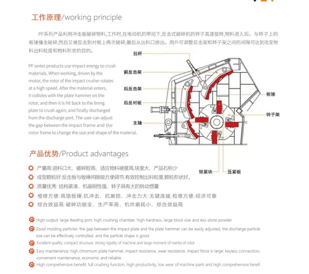 簡介—— PE反擊式破碎機是一種高效節(jié)能型破碎設(shè)備,其特點是破碎作業(yè)可充分利用整個轉(zhuǎn)子的能量,依靠高速旋轉(zhuǎn)的板錘打擊并拋射物料反復(fù)